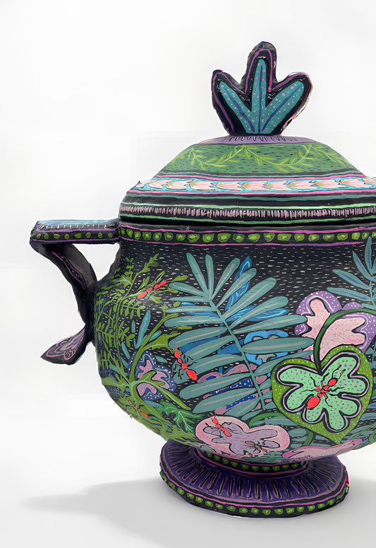 Hand-Painted Papier Mâché Tureen with Sculptural Handles