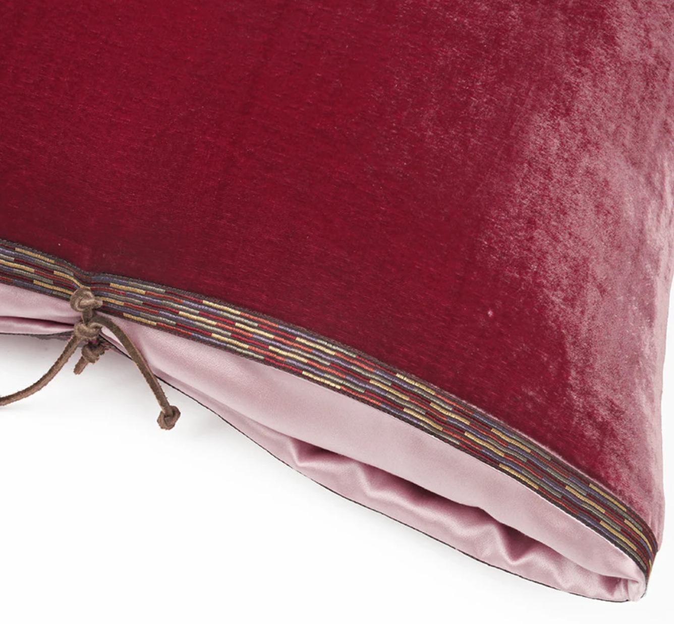 Constructed of silk and rayon velvet front and back, reflecting light and extremely luxurious and soft. The edge is finished with an intricately woven jacquard trim. It has a functional and decorative leather tie closure on two sides, and silk insert flap.  Professionally dry clean only.