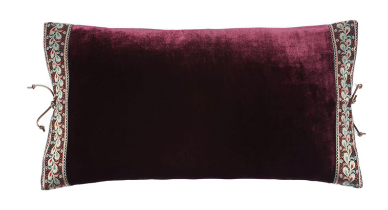 Constructed of silk and rayon velvet front and back, reflecting light and extremely luxurious and soft. The edge is finished with an intricately woven jacquard trim. It has a functional and decorative leather tie closure on two sides, and silk insert flap.  Professionally dry clean only.