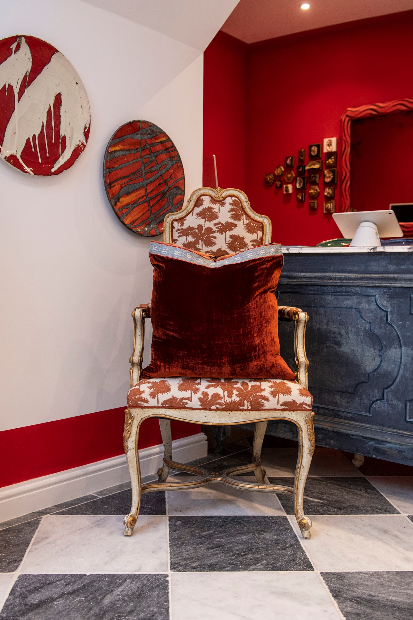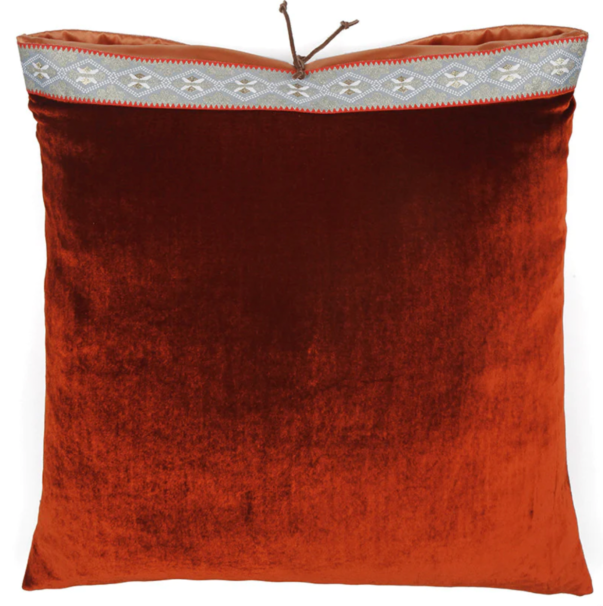 Constructed of silk and rayon velvet front and back, reflecting light and extremely luxurious and soft. The edge is finished with an intricately woven jacquard trim. It has a functional and decorative leather tie closure on two sides, and silk insert flap.  Professionally dry clean only.