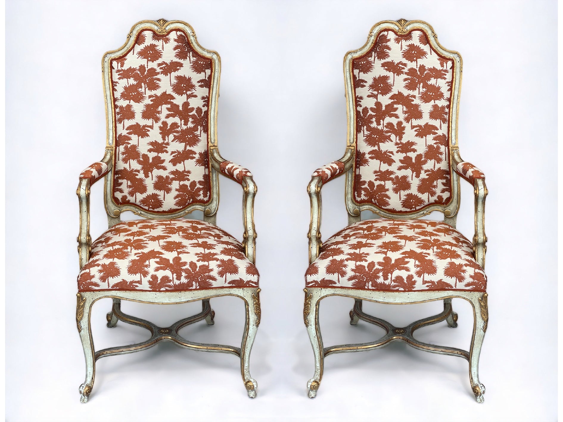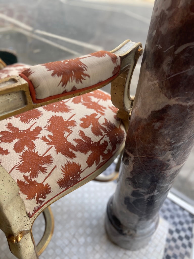 These chairs were recently restored to their grandeur, preserving the intricate golden embellishments. Reupholstered in a textured jacquard fabric from Dedar Milano with a palm tree pattern, they are both comfortable and decorative.