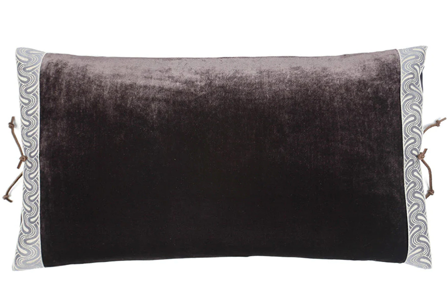 Constructed of silk and rayon velvet front and back, reflecting light and extremely luxurious and soft. The edge is finished with an intricately woven jacquard trim. It has a functional and decorative leather tie closure on two sides, and silk insert flap. Professionally dry clean only.