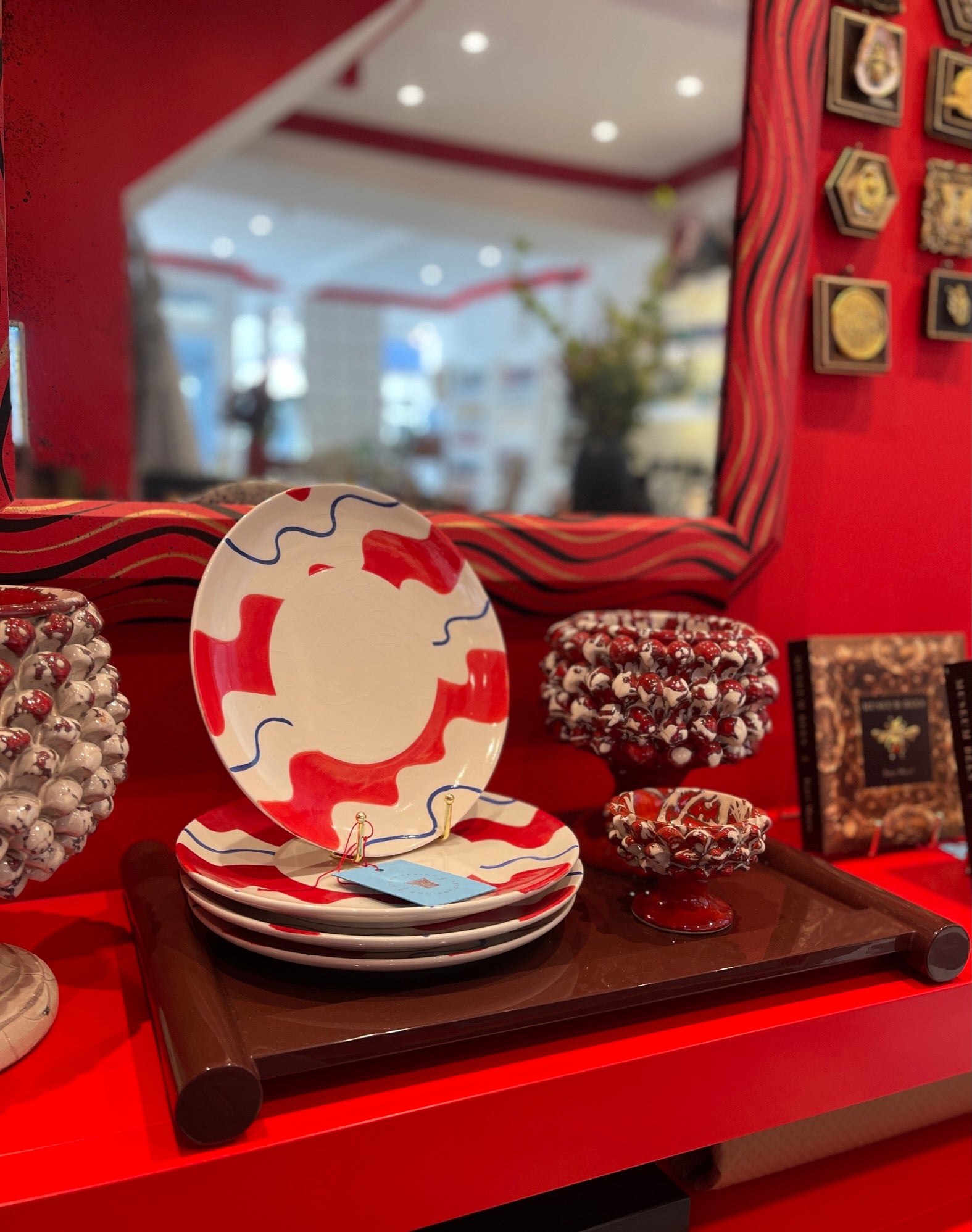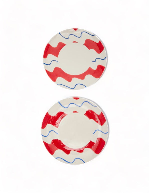 Red and blue squiggles hand painted across Portuguese porcelain creating a unique vibrant look to any table setting.